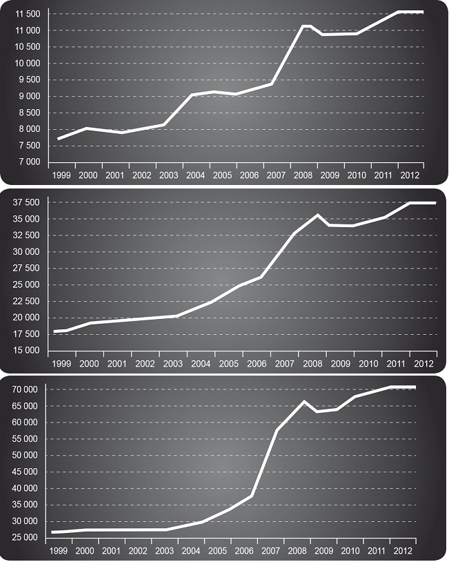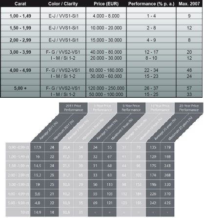 Thực tế cho thấy giá kim cương có sự tăng trưởng đều và liên tục vì vậy sau vàng đến lượt kim cương được coi là một phương tiện đầu tư ổn định. Công cụ này được chứng tỏ qua những thời gian khủng hoảng kinh kế. Từ giữa năm 2007 khủng hoảng kinh tế bắt nguồn từ khủng hoảng thế chấp, khiến nhiều nhà đầu tư quan tâm đến kim cương, làm giá trị của nó tăng lên nhanh chóng và ngừng lại vào giữa năm 2008. Tuy nhiên sự tăng giá mạnh này lại phản ánh sự tăng giá của đồng USD. Chỉ đến cuối năm 2008 có một sự sụt giảm nhẹ, như vậy nhìn tổng thể trong cả năm 2008 giá trị kim cương vẫn ổn định tích cực.