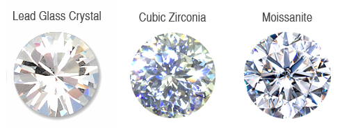 Từ trái sang phải : Thuỷ Tinh, Cubic Zirconia (CZ), Moissanite